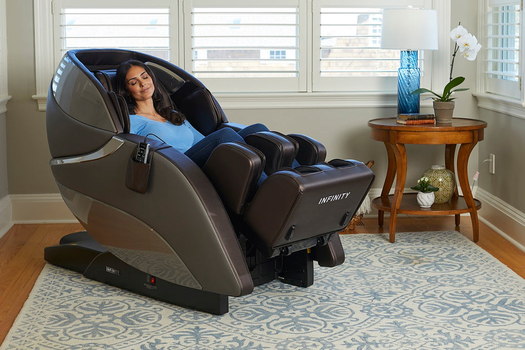 Gen Max 4D is all about customized massage — you control the intensity and target relief, from the speed and depth of the rollers, to how much the airbags are inflating, to the music that is played on the speakers. Use the all-new, intuitive Infinity Controller, or connect your phone through Bluetooth and use the Gen Max App which puts the chair controls into your own pocket. The 4D Back Massage Mechanism gives you deep-tissue massage that mimics the feel of human hands massaging down your back and into your glutes. For the ultimate back relief, try the Spinal Decompression Stretch feature in the Extension program, Weightless Zero Gravity Recline or the built-in soothing Nature Sounds. And let's not forget the lower half of your body with the Complete Calf™ Kneading & Oscillating massage combined with the Triple Roller Total Sole Reflexology rollers — much needed relief after being on your feet all day. Worried about space? Relax, the Zero Wall Fit™ Space-Saving Technology requires only 2" of space behind the backrest at any given position.